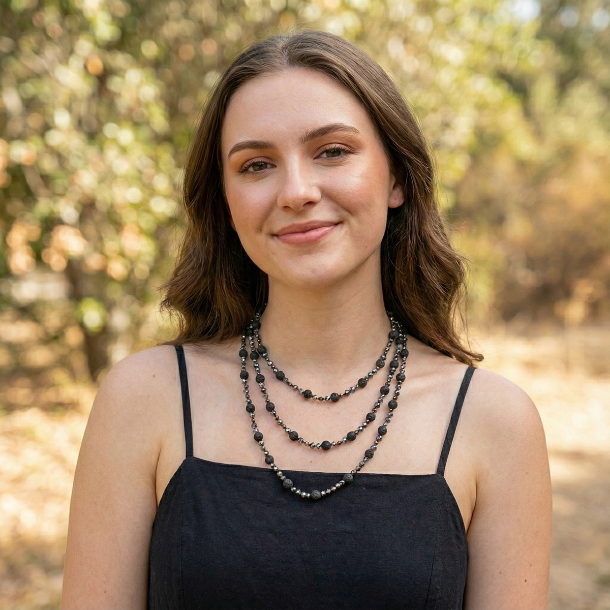 Genuine Lava Stone: Porous matte black beads offering grounding energy and rich, natural texture.