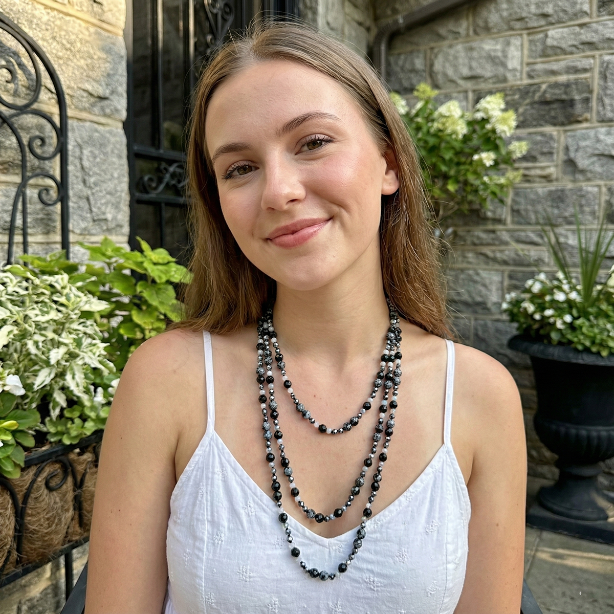 Make a bold and beautiful statement with our 48" Mixed Snowflake Obsidian, Black Onyx, Titanium and Moonstone Necklace, a captivating blend of dark elegance and ethereal glow. This long, versatile strand features the smoky patterns of snowflake obsidian, the glossy depth of black onyx, the cool metallic shine of titanium, and the soft iridescence of moonstone—creating a harmonious design that feels both grounded and celestial.