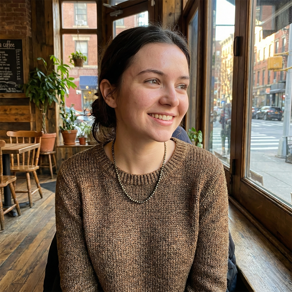 Woman wearing a purple cardigan and gray sweater with a necklace, sitting indoors.