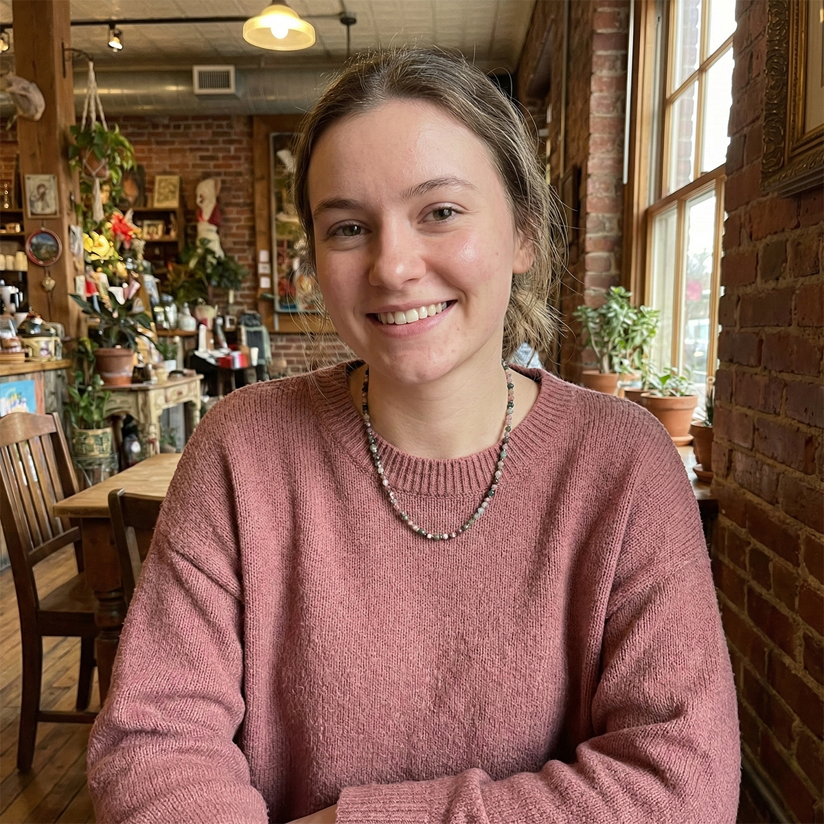 Woman sitting at a wooden table outdoors with potted plants in the background