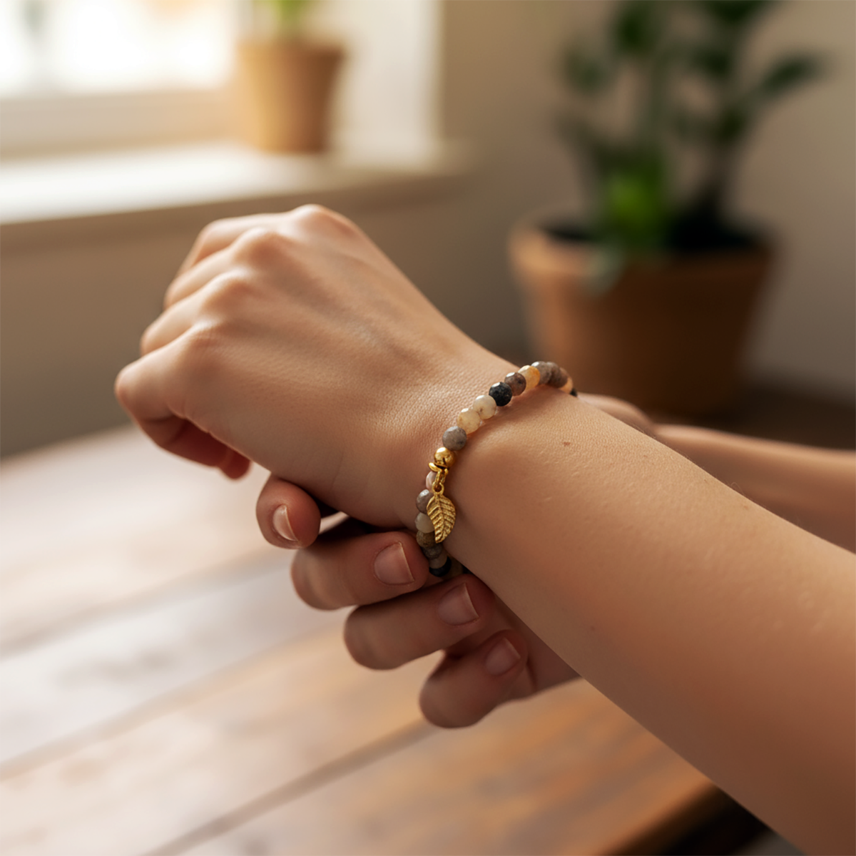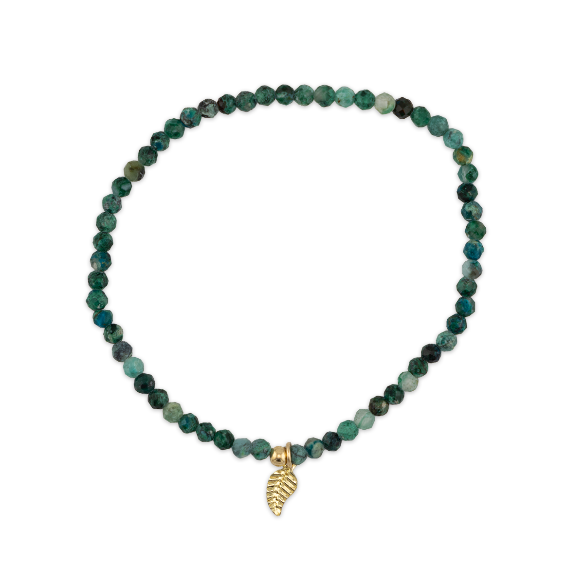 Green beaded bracelet with a gold leaf charm on a wrist, blurred indoor background