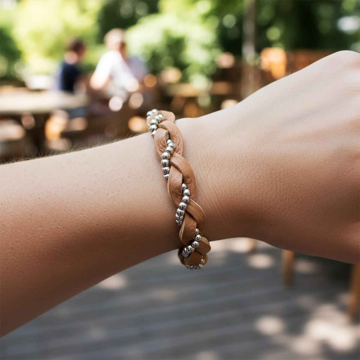 Cognac Italian Leather Braid & Freshwater Pearl Bracelet
