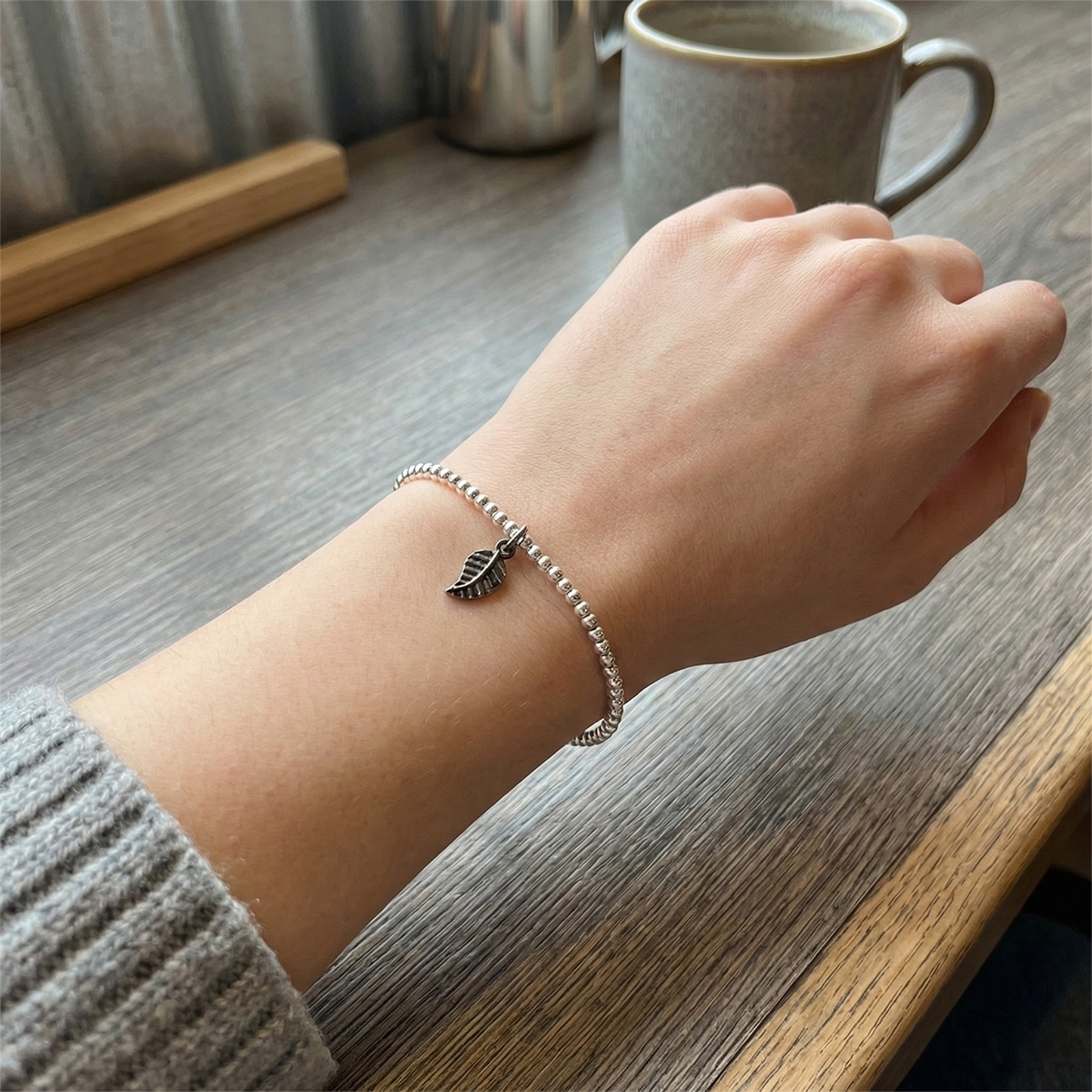 Hand wearing a silver bracelet with a leaf charm on a wooden surface with a cup in the background