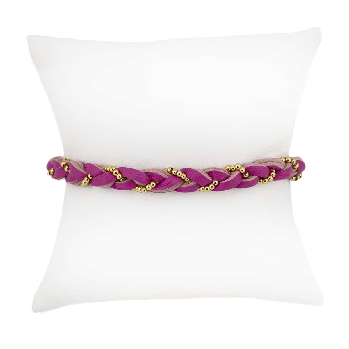 Elevate your everyday style with our Pink Italian Leather Braid & Gold Bracelet, a chic and modern accessory crafted for women who love effortless luxury. This handcrafted bracelet pairs soft Italian leather with radiant gold accents, creating a timeless piece that adds elegance to any look.