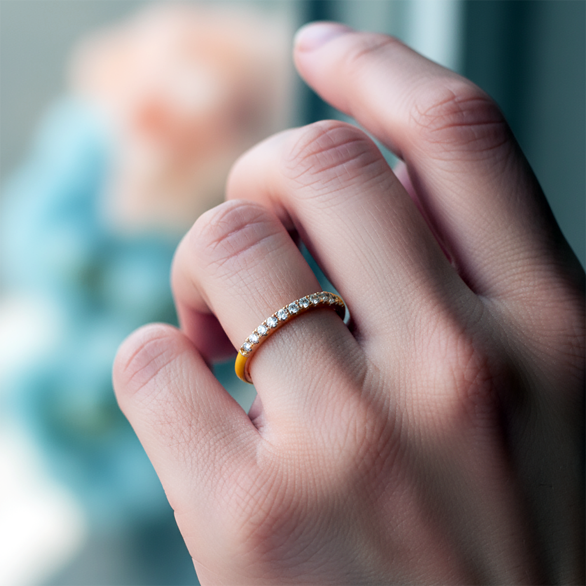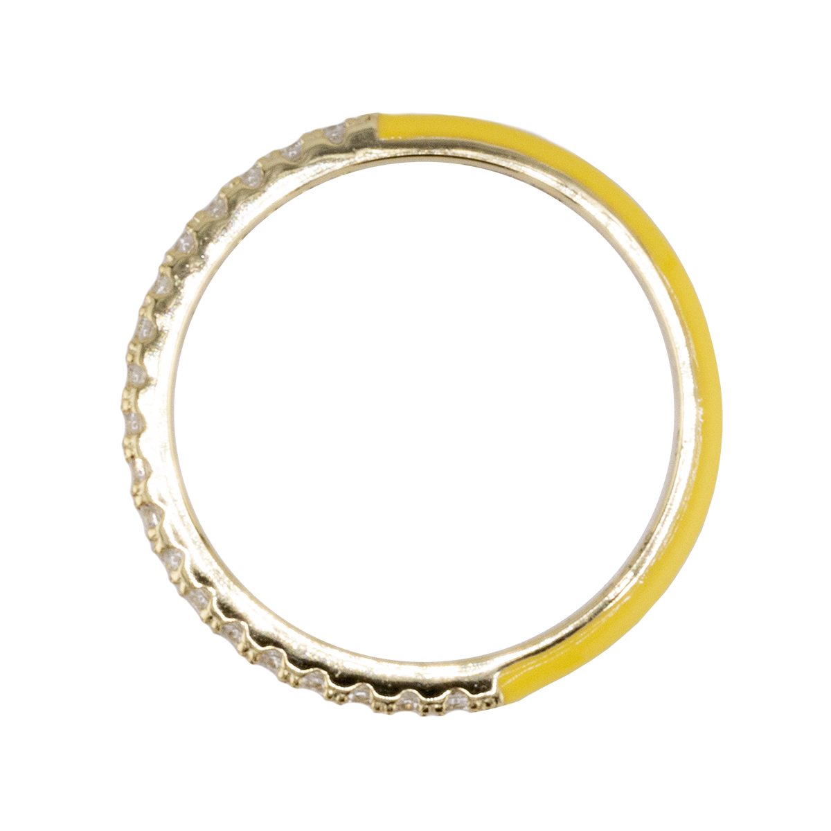 This elegant ring blends the timeless brilliance of 18K Gold Plating and .925 Sterling Silver with a modern touch of color. Featuring a row of sparkling stones that transition into a smooth enamel band in a vibrant Limoncello hue, it offers a perfect balance of sophistication and style. Ideal for stacking or wearing solo, this piece adds a bold yet refined pop of color to any look.