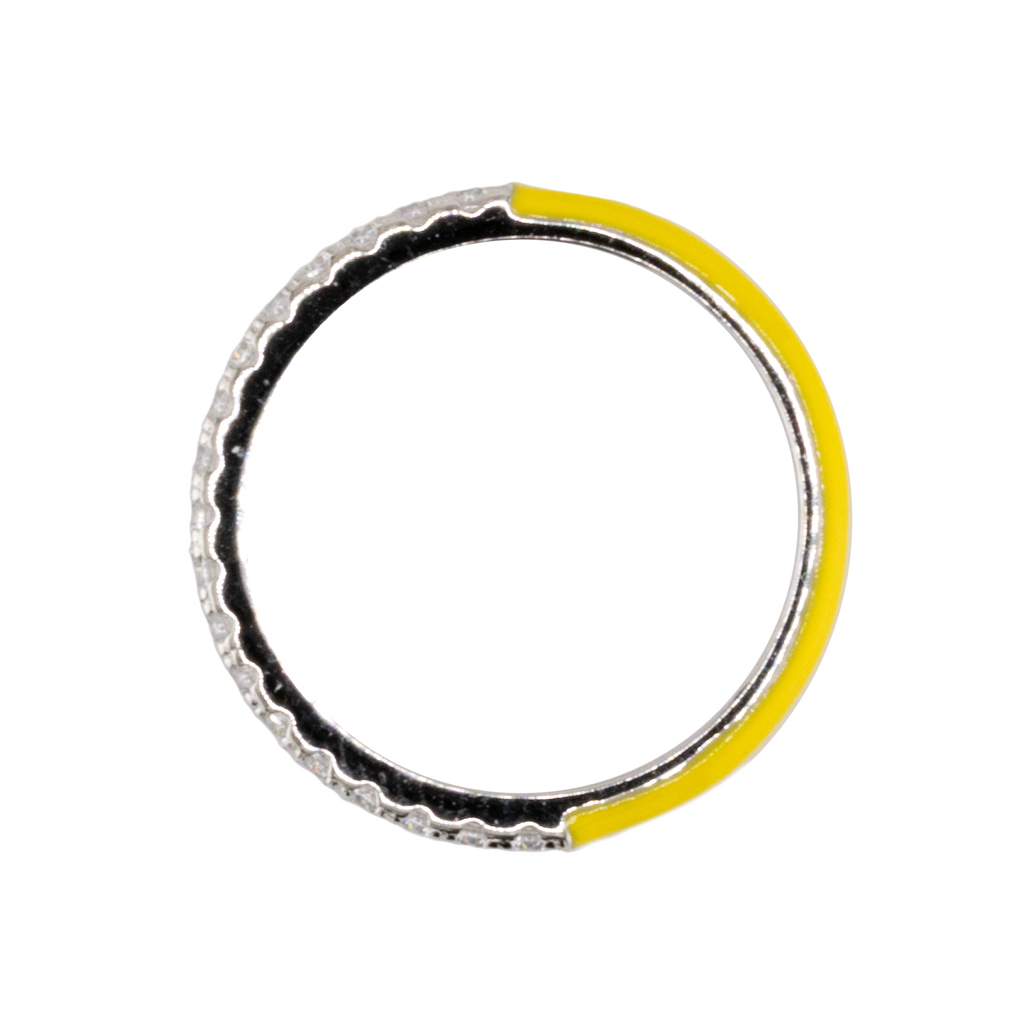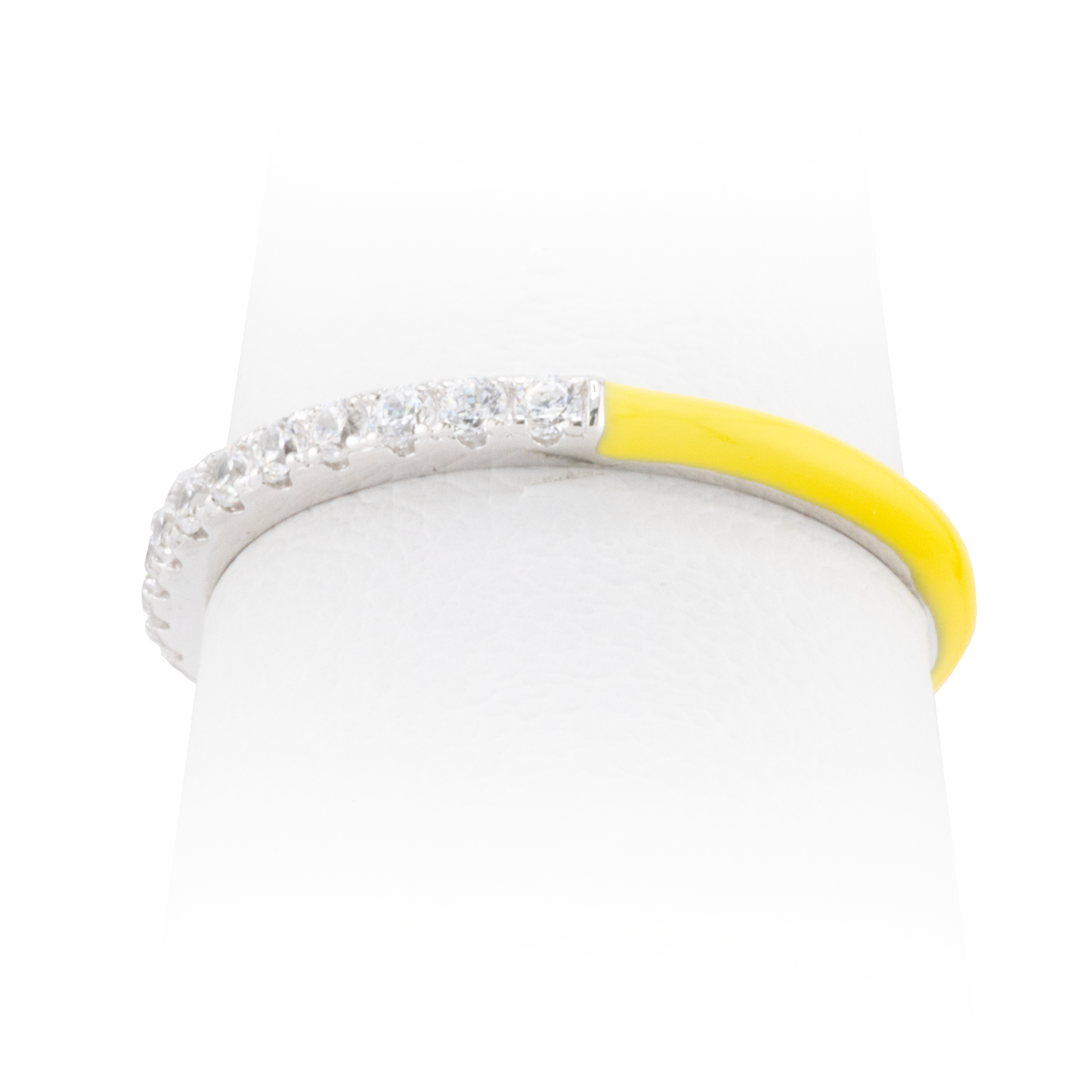 This elegant ring blends the timeless brilliance of .925 Sterling Silver with a modern touch of color. Featuring a row of sparkling stones that transition into a smooth enamel band in a vibrant Limoncello hue, it offers a perfect balance of sophistication and style. Ideal for stacking or wearing solo, this piece adds a bold yet refined pop of color to any look.