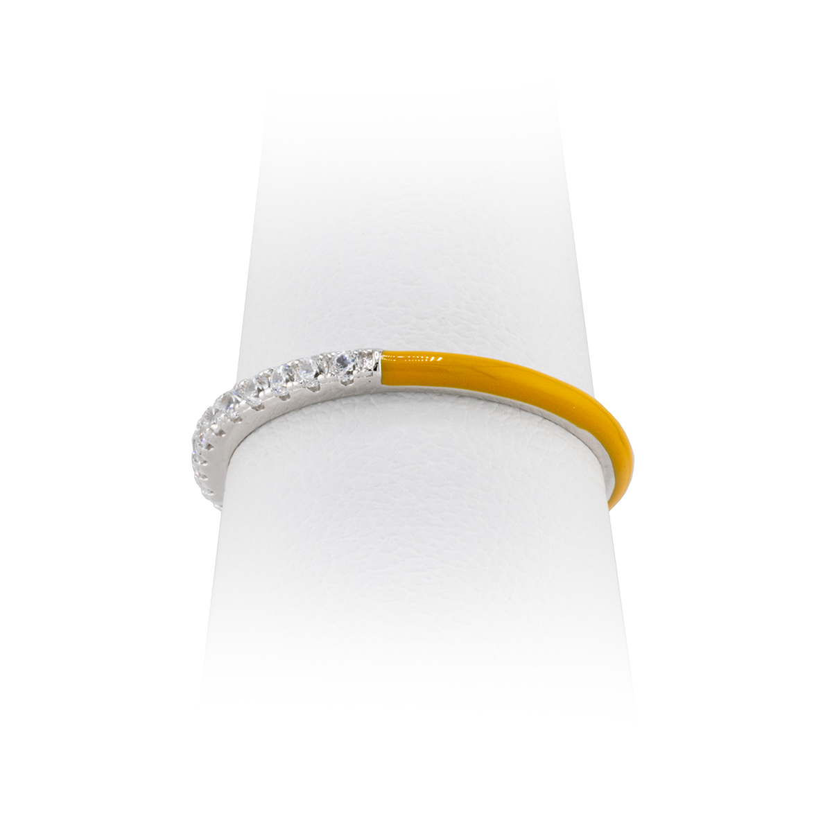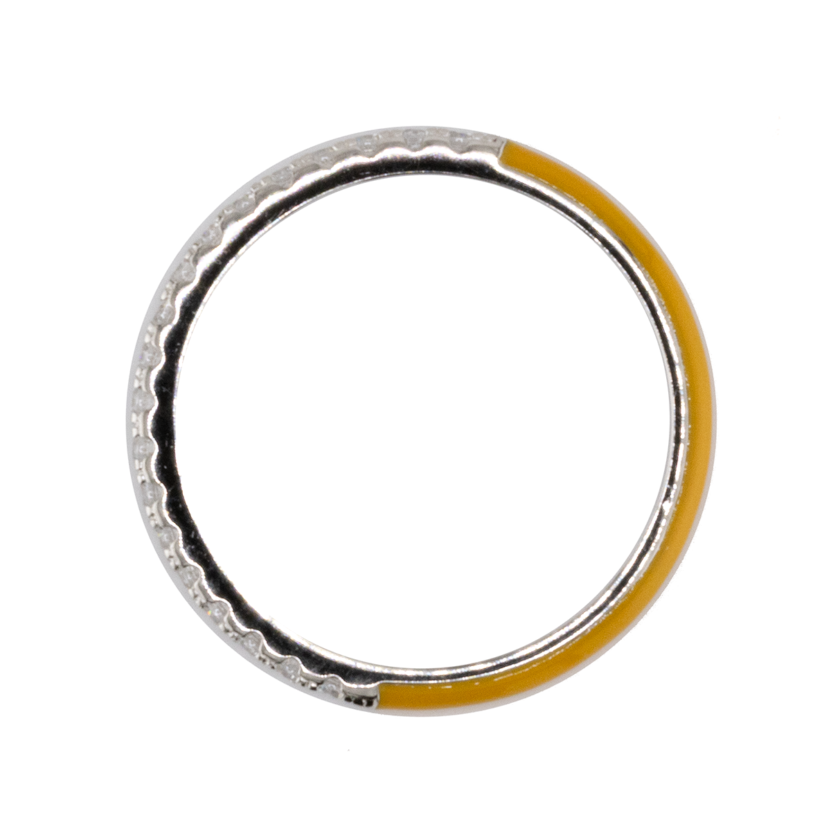 This elegant ring blends the timeless brilliance of .925 Sterling Silver with a modern touch of color. Featuring a row of sparkling stones that transition into a smooth enamel band in a vibrant Mandarin hue, it offers a perfect balance of sophistication and style. Ideal for stacking or wearing solo, this piece adds a bold yet refined pop of color to any look.