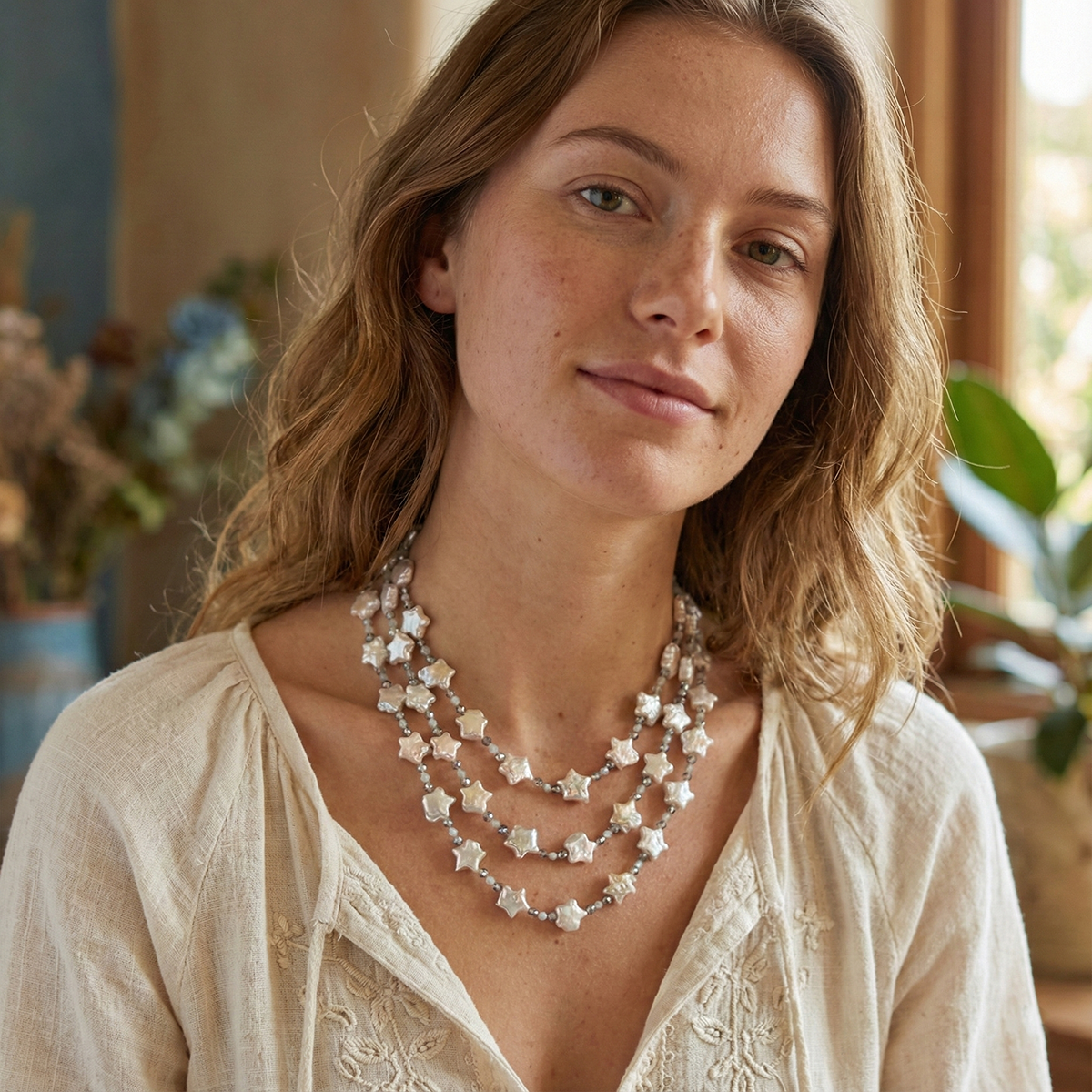 Paired with the pearl star is a faceted gray crystal, chosen for its cool neutrality and understated sparkle. Gray crystal represents balance, calm, and subtle strength—creating a beautiful contrast with the pearl’s soft iridescence. Its muted shine makes this necklace incredibly easy to dress up or down.