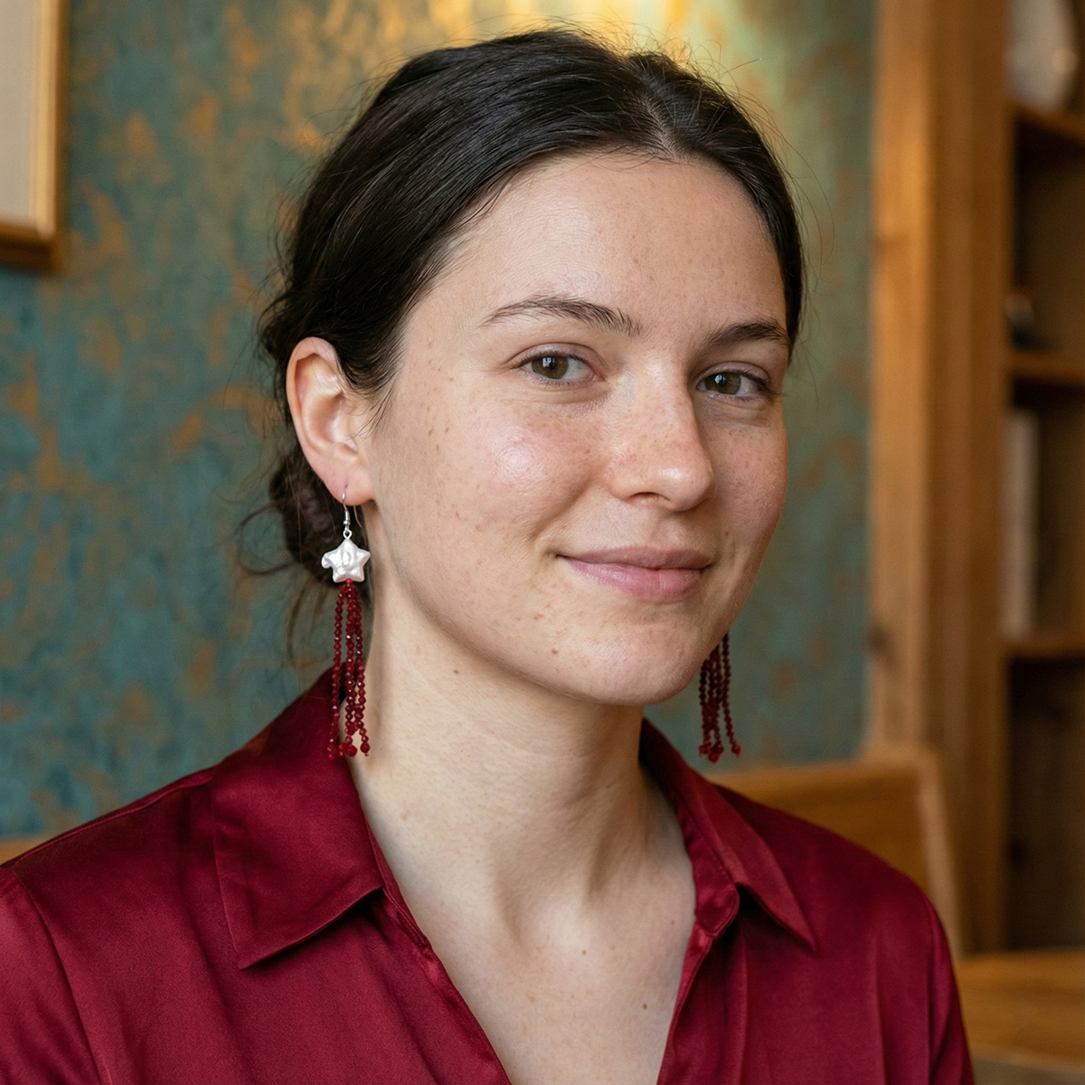 Pair of earrings with star-shaped beads and red tassels on a white background