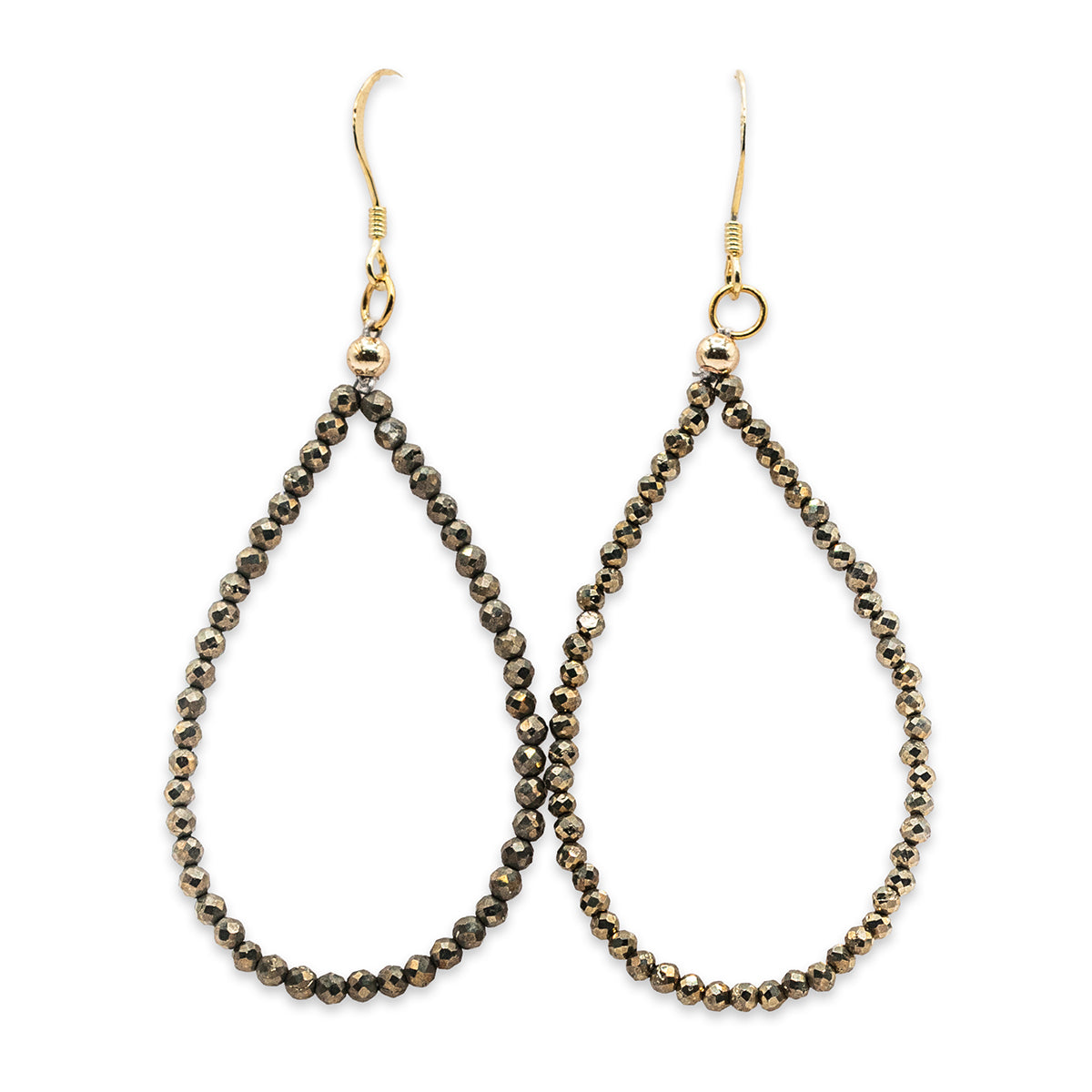 Add grounded sophistication and natural shimmer to your jewelry collection with our Pyrite Gemstone Hoops. Featuring genuine pyrite beads known for their striking gold-toned metallic luster, these earrings bring a bold yet earthy elegance to a clean, modern hoop silhouette. Lightweight, versatile, and full of natural character, these gemstone hoops are the perfect accessory for everyday wear or elevated boho style.