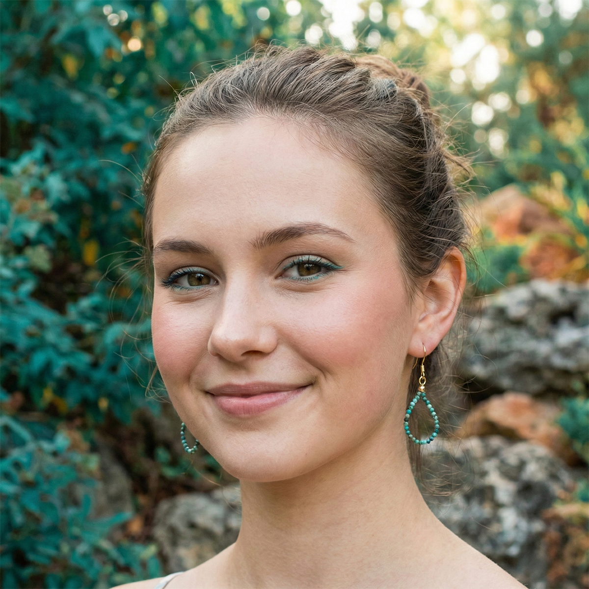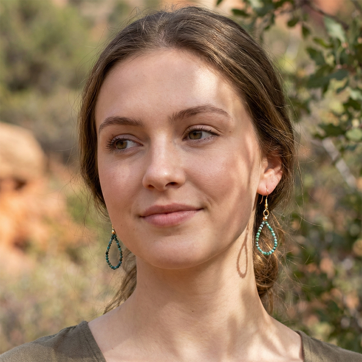 Though small in size, each bead is full of personality—showcasing unique natural patterns in blends of teal, turquoise, brown, and black. Set on sleek hoop bases, these earrings offer a refined, delicate look that transitions seamlessly from casual days to polished evenings. They’re perfect for layering, mixing with other earrings, or wearing solo for a soft, nature-inspired accent.