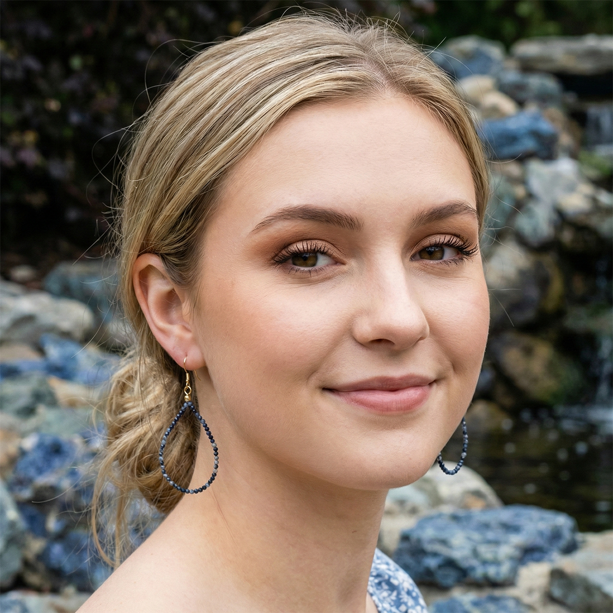 Elevate your jewelry collection with the rich, classic beauty of our Sapphire Gemstone Hoops. Designed with genuine sapphire beads known for their deep navy color and luminous sheen, these earrings bring refined elegance and natural gemstone sophistication to a sleek, modern hoop silhouette. Lightweight, luxurious, and effortlessly stylish, they make the perfect statement for both everyday wear and special occasions.