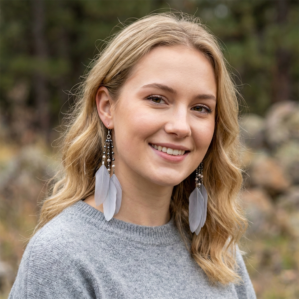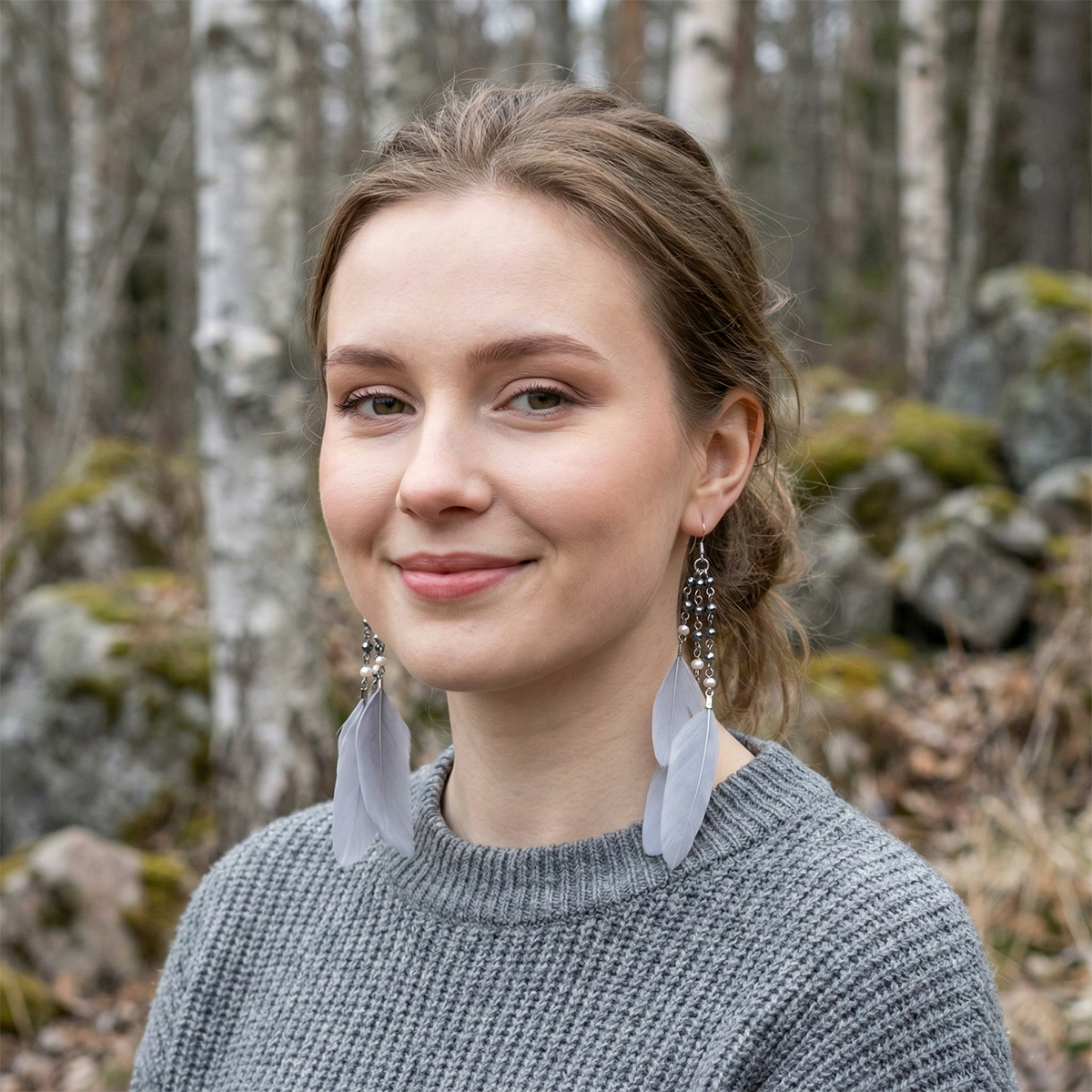The soft gray feather introduces an airy, neutral elegance that pairs effortlessly with any outfit. Titanium hardware offers a modern metallic edge while staying hypoallergenic and ultra-light for all-day comfort. A smooth, radiant pearl completes the design, adding a timeless touch that balances the natural texture of the feather.