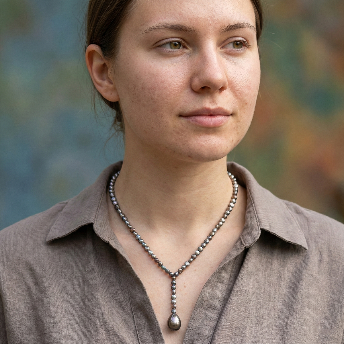 At the heart of this necklace is a stunning Tahitian pearl, prized for its rich dark tones and luminous overtones of peacock green, charcoal, silver, and midnight blue. Each pearl is naturally unique, offering its own depth, luster, and organic variation—making your necklace truly one of a kind.