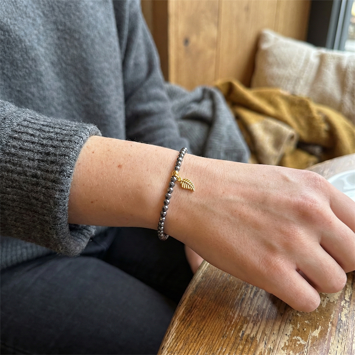 A delicate gold tone leaf charm hangs from the center to provide a warm contrast against the dark beads. This natural element softens the industrial look of the stones and creates an interesting balance of colors. The elastic cord design ensures a comfortable fit that is easy to put on and take off without needing a clasp.